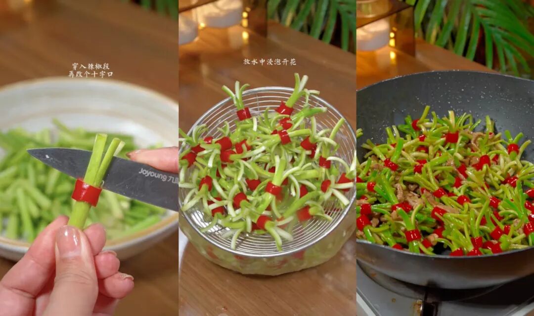 做法大概是:蒜苔切成大概大拇指长度的小段,在每根蒜苔中间穿一个小米椒,再用刀把蒜苔打上十字刀口,随后放到凉水里浸泡。泡过十分钟,蒜苔就会出现开花的效果,开花之后入锅跟肉一起炒。这就是很好看又很吉祥的“花开富贵”。