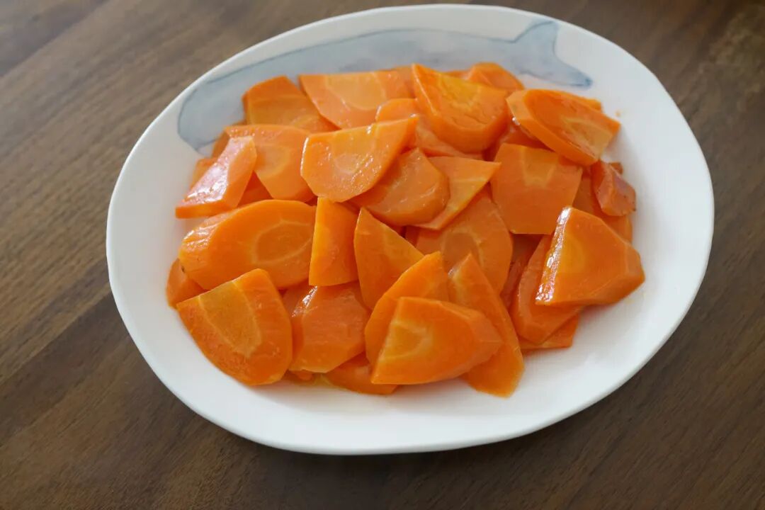 这个菜的做法格外的简单,就是把胡萝卜切成薄片,用油炒一下,然后用几乎没过胡萝卜的水,一直焖煮到水完全烧干。这样胡萝卜会变得很糯软、非常甜。不再有很多人不喜欢的胡萝卜青草味。
